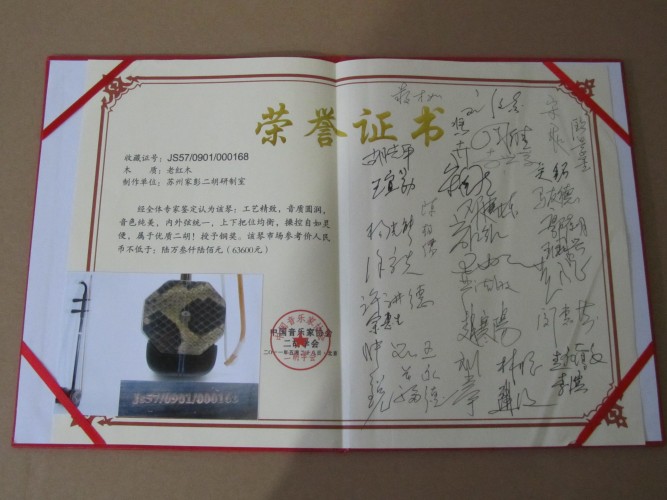 二胡制作大師丁家彭先生1949年出生樂(lè)器世家,17歲隨其祖父學(xué)琴藝,并深得精髓,其聰穎好學(xué),悉心鉆研與 探求二胡制作,博得同行的欽佩贊許,更得了許多知名演奏家的稱(chēng)贊,充分認(rèn)識(shí)到二胡制作每個(gè)環(huán)節(jié),都對(duì)二胡制作都有影響力,因此對(duì)二胡的選材,選料,蟒皮都十分嚴(yán)格,二胡整體穩(wěn)定性良好,環(huán)境干擾影響極小。